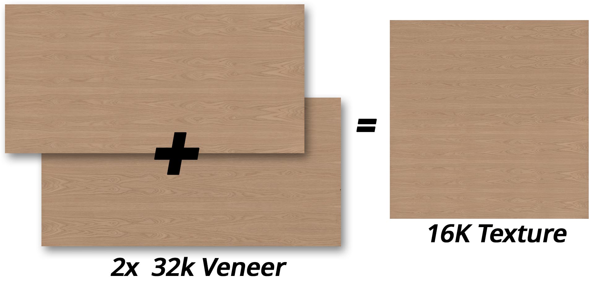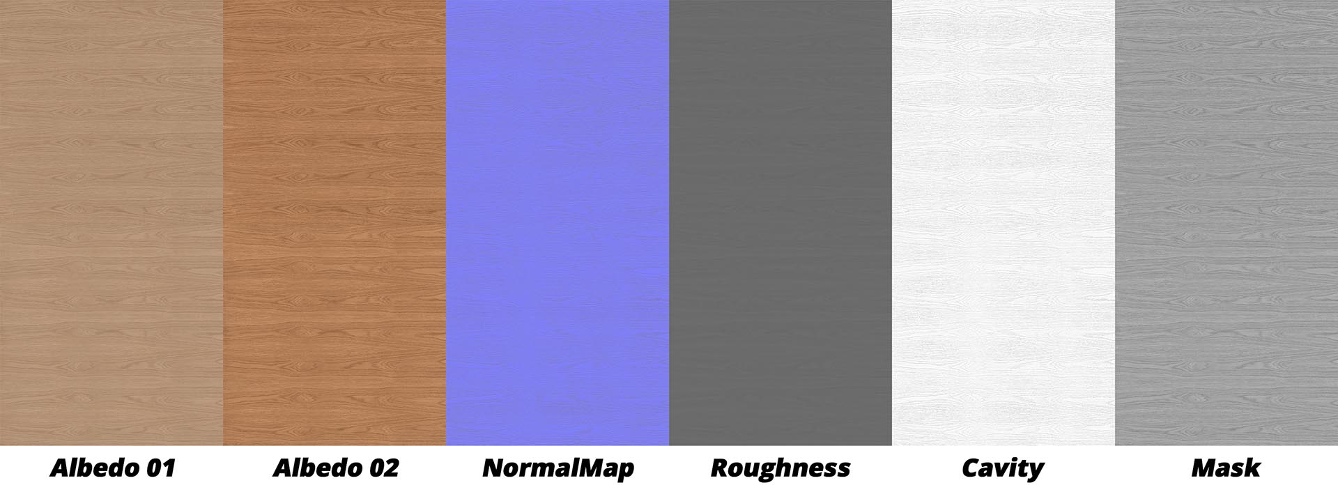 Cada una de las 5 especies incluidas (roble, haya, cerezo, iroko y arce) ha sido fotografiadas a 32K y posteriormente optimizada a 16K, garantizando una gran nitidez, detalle fino y una escala real de 250 × 250 cm por textura. Esto se traduce en un texel density máximo de 64,5 px/cm. También se incluyen versiones optimizadas a 8K y 4K, para una mayor flexibilidad según el tipo de proyecto.