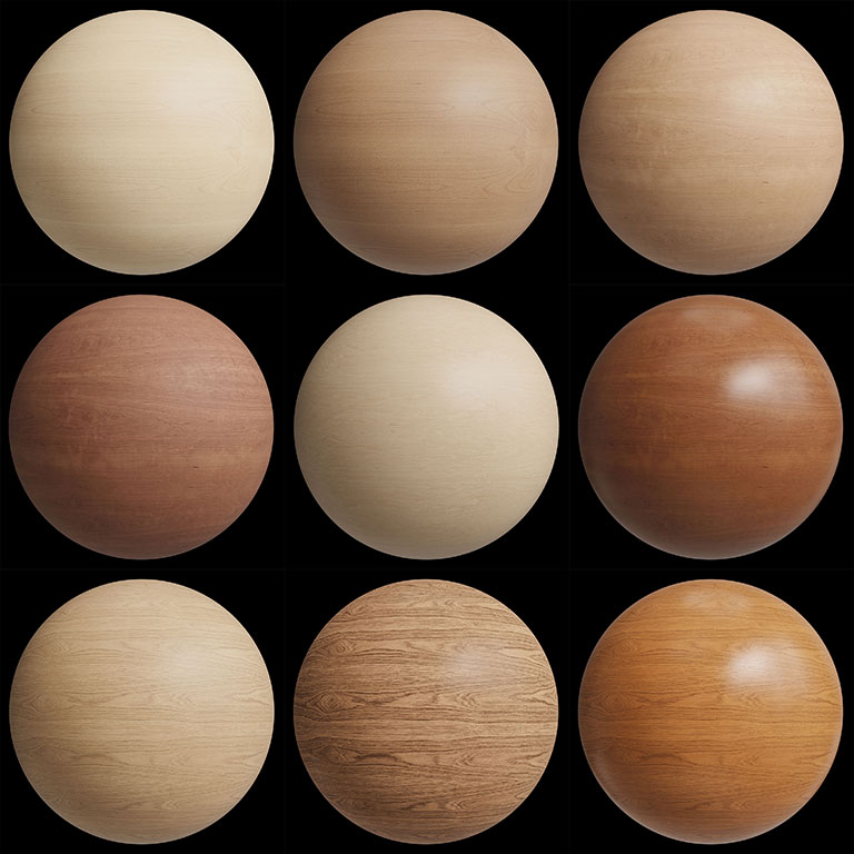El pack incluye una librería de materiales PBR listos para usar en V-Ray y Corona Renderer, perfectamente organizada por especie y acabado. En total, obtienes 80 materiales únicos, listos para aplicar en tus escenas con rapidez, control artístico y máxima calidad.