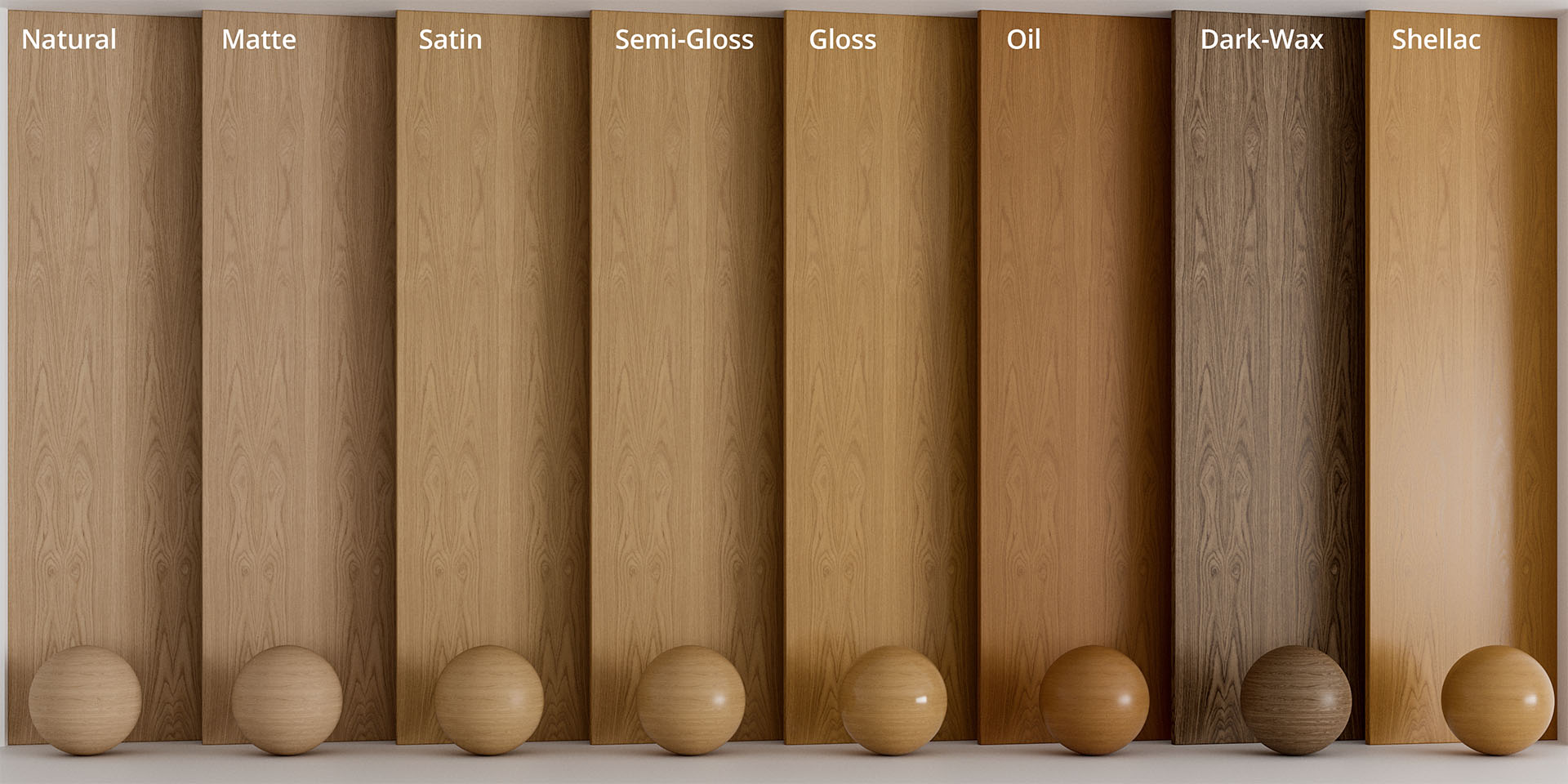 Además, cada madera está disponible en 2 variantes cromáticas y 8 acabados físicos reales (natural, mate, satinado, semibrillante, brillante, aceitado, cera oscura y goma laca), simulando los tratamientos más comunes en arquitectura y ebanistería.