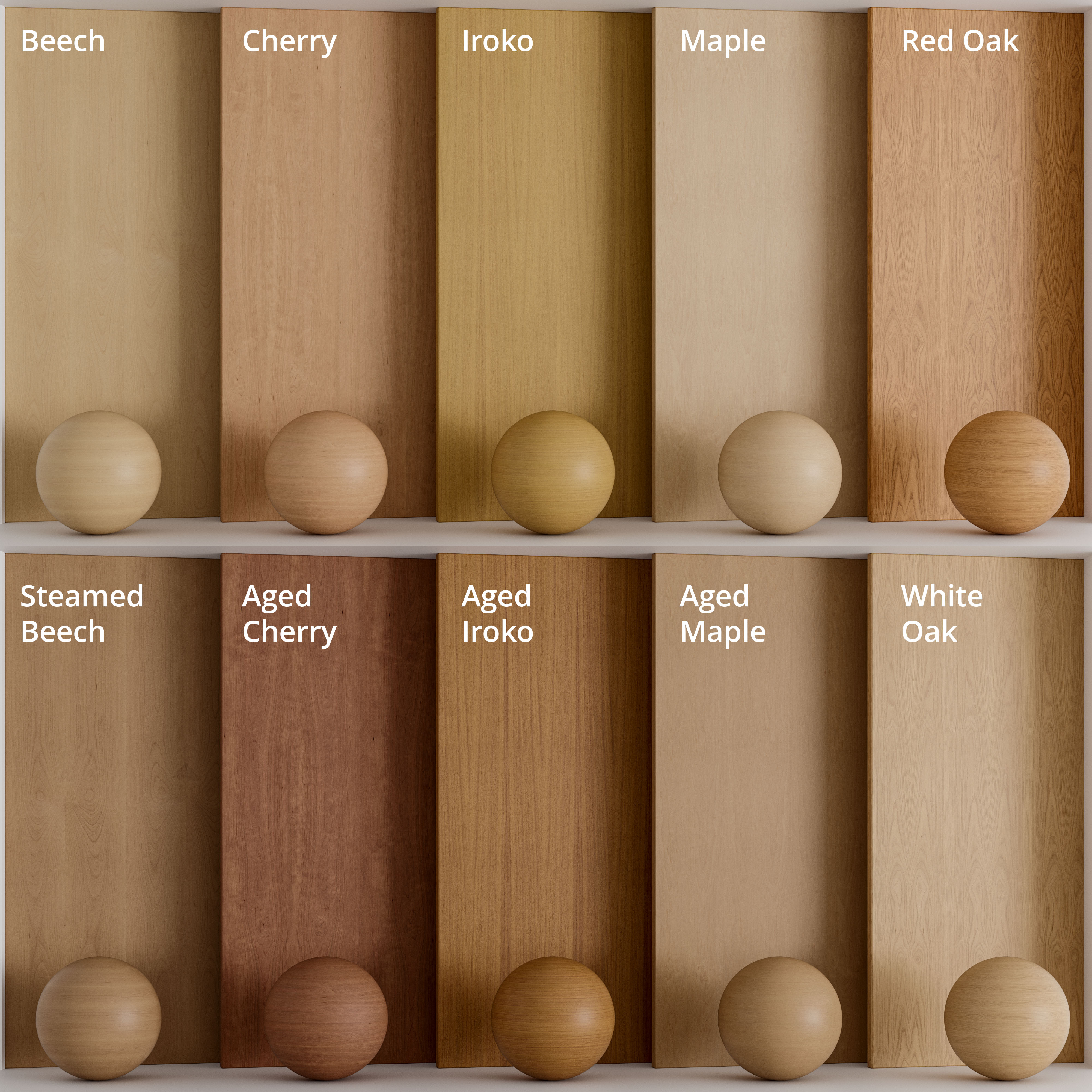 10 Albedos diferentes de algunas de las maderas más usadas en ArchViz y 8 acabados diferentes por Albedo. 80 variaciones en total.